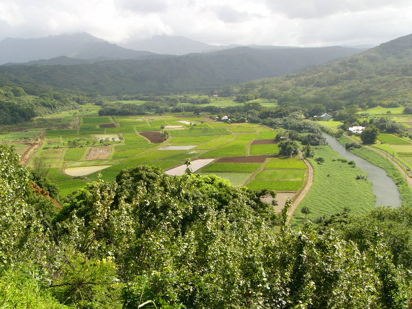 One of the most photographed scenes of Kauai, the Hanalei Valley overlook. Taro, the staple food of old Hawaii, is still grown in the valley to make poi. Taro grows in water, so the land also serves as a bird refuge. Most people do not like poi; it's a bit of acquired taste.