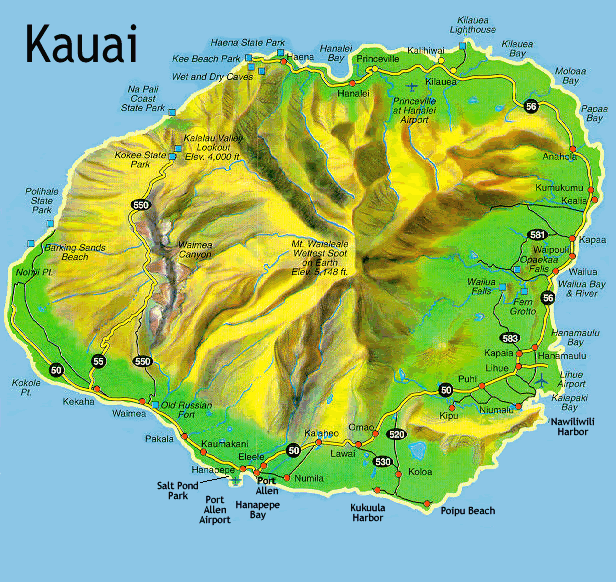The island of Kaua'i is about 40 miles by 40 miles - not very large at all. In spite of its small size, it has many micro-climates so that there is desert and rain forest in the same little island. In fact. traditionally Mt. Wai'ale'ale is considered "the wettest spot on earth." The average rainfall on the mountain is 460 inches per year, and the record was 683 inches recorded in 1982. Luckily, the mountain is in the middle of island. It is perfectly situated to pick up the moisture from the tradewinds.